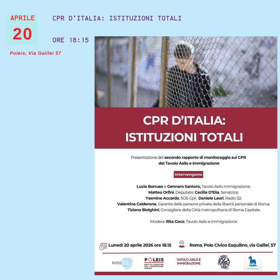 Lunedì 20 aprile Ore 18:15 Polo Civico Esquilino, via Galilei 57 Un appuntamento necessario — NO ai CPR Verrà presentato il secondo rapporto di monitoraggio riporta al centro quello che troppo spesso viene nascosto: cosa succede dentro questi luoghi, e perché riguarda tuttə.