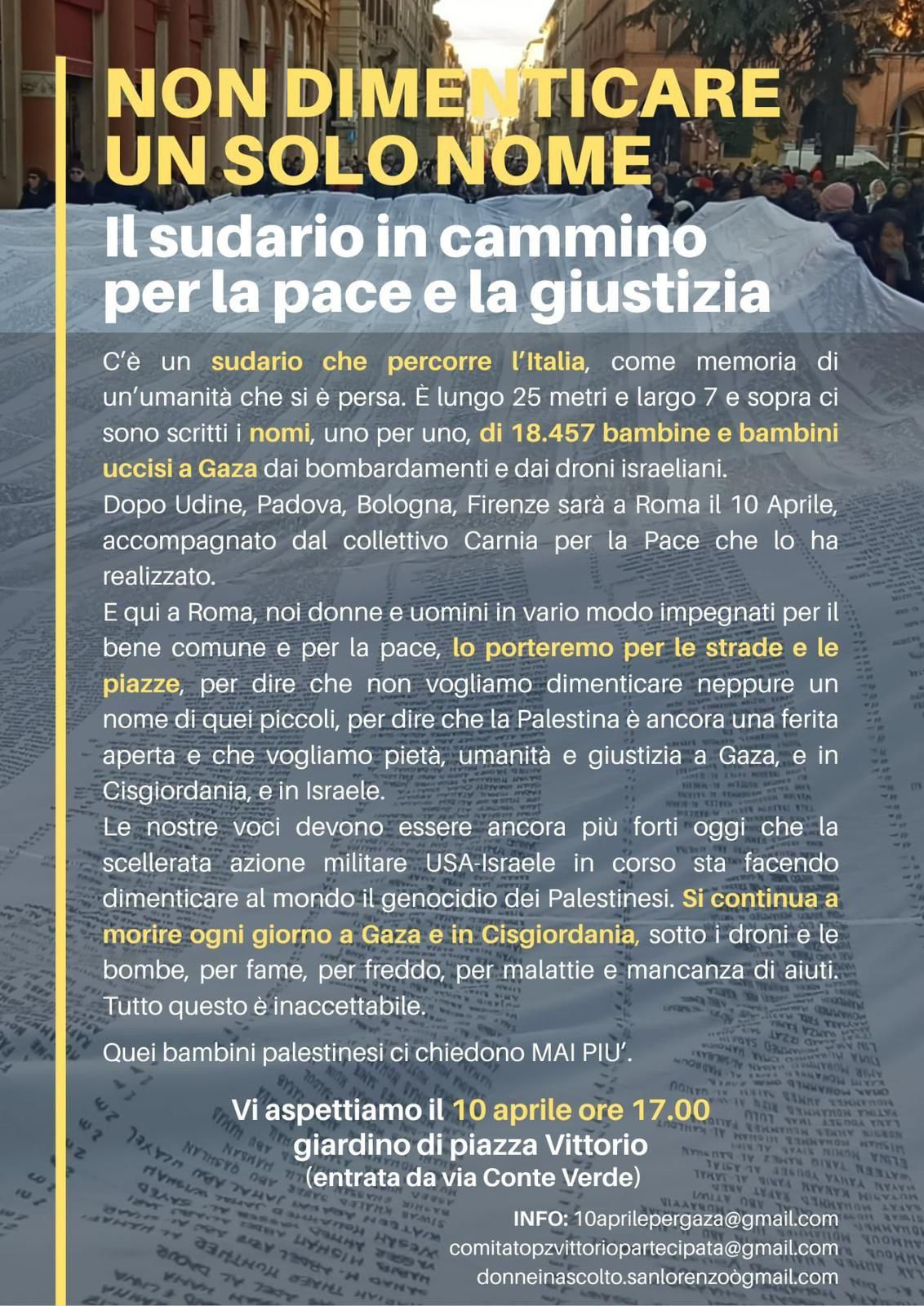 Un grande sudario con i nomi di oltre 18.000 bambini vittime di genocidio verrà portato in corteo fino al Verano.