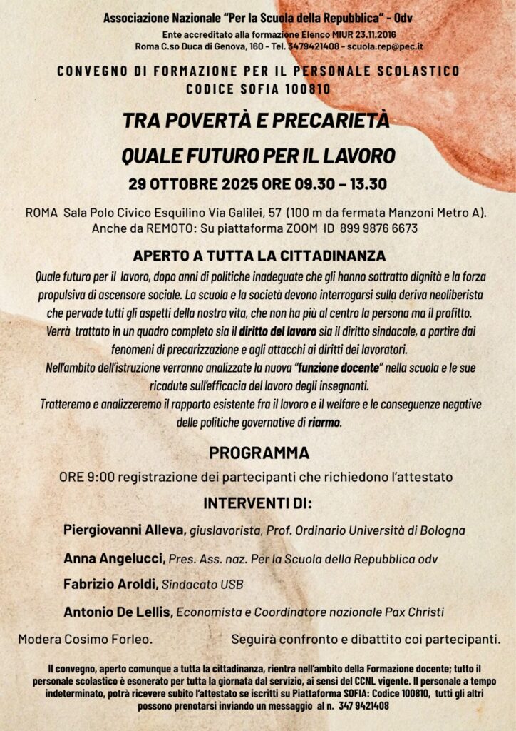 Convegno di formazione: “Tra povertà e precarietà. Quale futuro per il lavoro” 29 ottobre 2025, ore 9.30 – 13.30 Sala Polo Civico Esquilino, Via Galilei 57 (Metro A – Manzoni)Anche da remoto: Piattaforma Zoom – ID 899 9876 6673 Un incontro per riflettere sul futuro del lavoro, tra precarietà, diritti e derive neoliberiste che minacciano … Leggi tutto